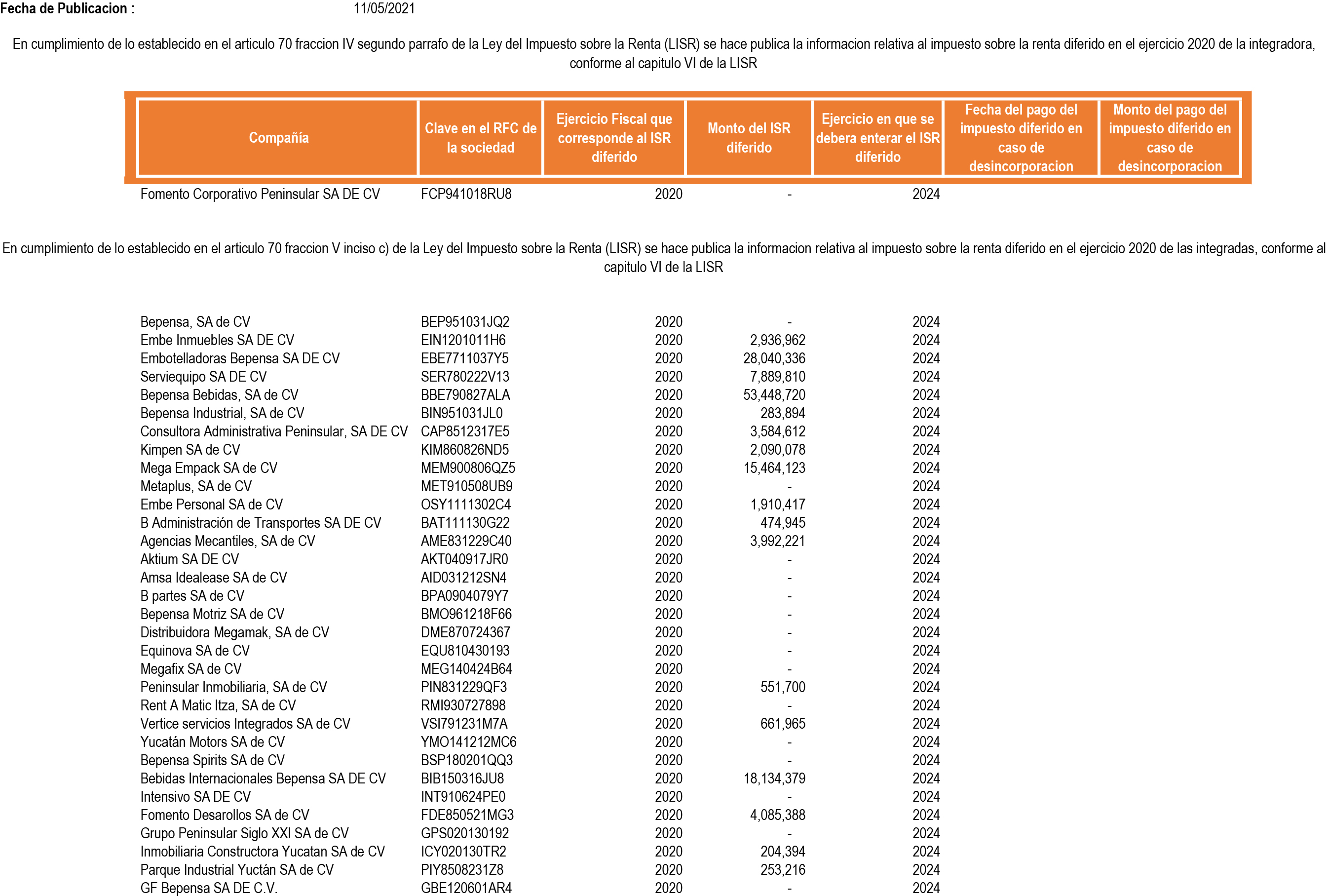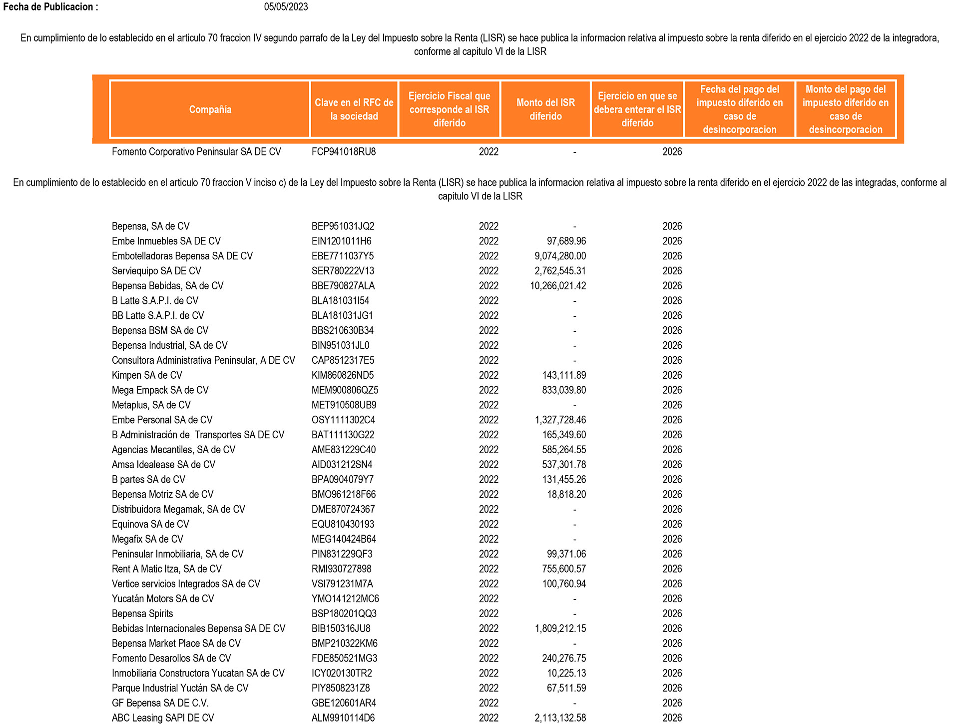 En cumplimiento al artículo 70 fracción V inciso c) de la Ley del Impuesto Sobre la Renta vigente (LISR) se hace pública la información relativa al impuesto sobre la renta diferido en el ejercicio fiscal 2015 de las Integradas, conforme al Capítulo VI de la LISR (del régimen opcional para grupos de sociedades). El ISR diferido es el siguiente: