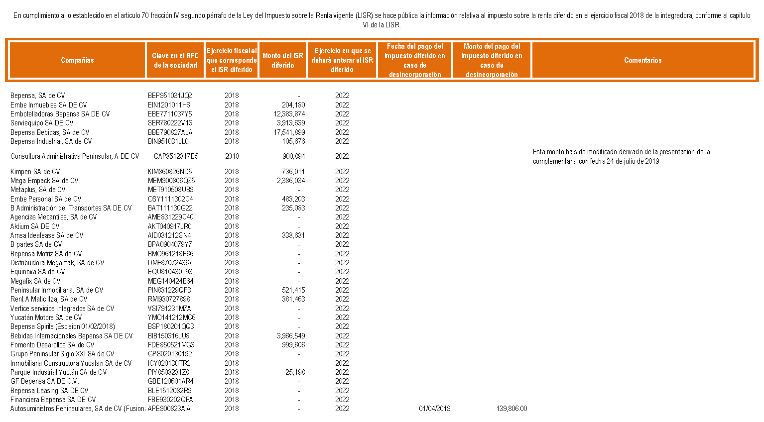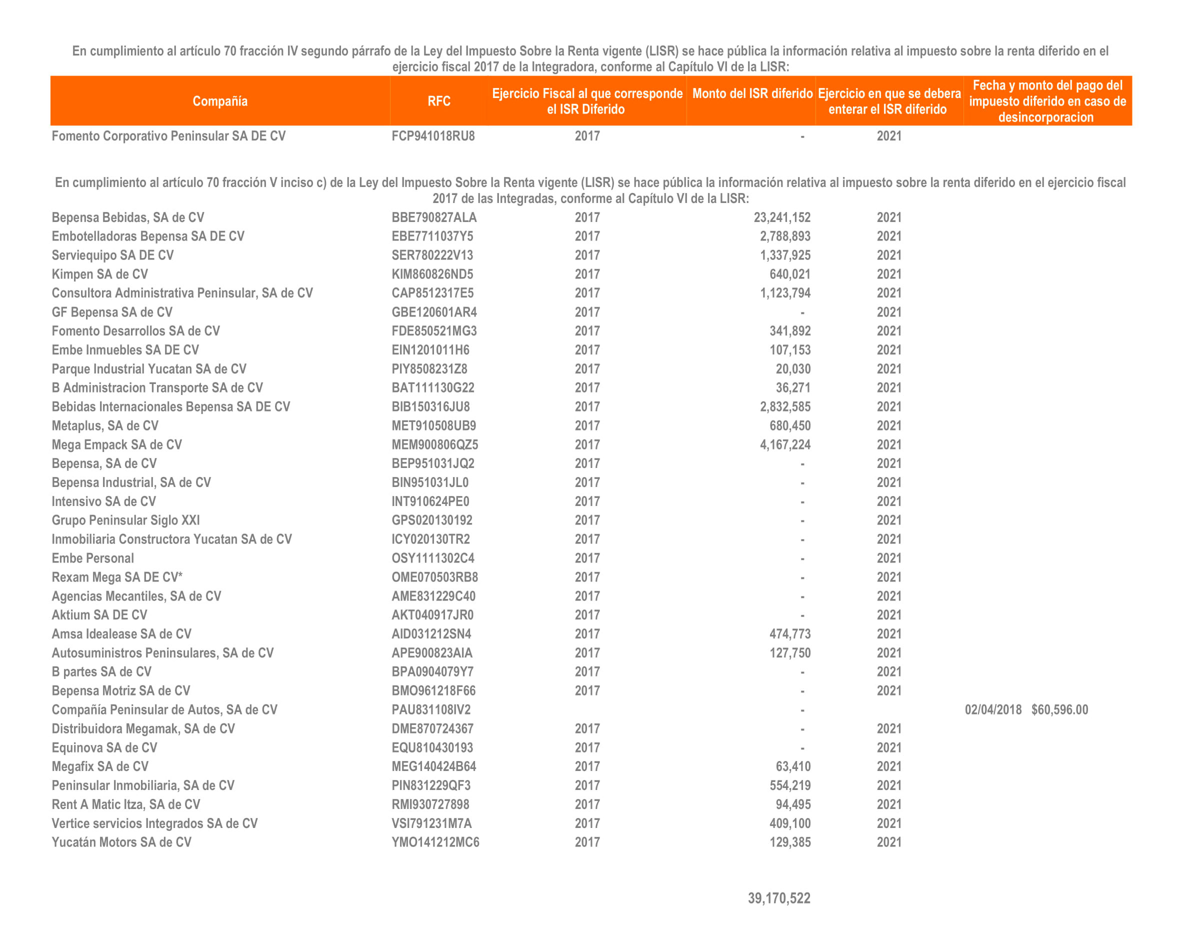 En cumplimiento al artículo 70 fracción V inciso c) de la Ley del Impuesto Sobre la Renta vigente (LISR) se hace pública la información relativa al impuesto sobre la renta diferido en el ejercicio fiscal 2016 de las Integradas, conforme al Capítulo VI de la LISR (del Régimen Opcional para Grupos de Sociedades). El ISR diferido es el siguiente: