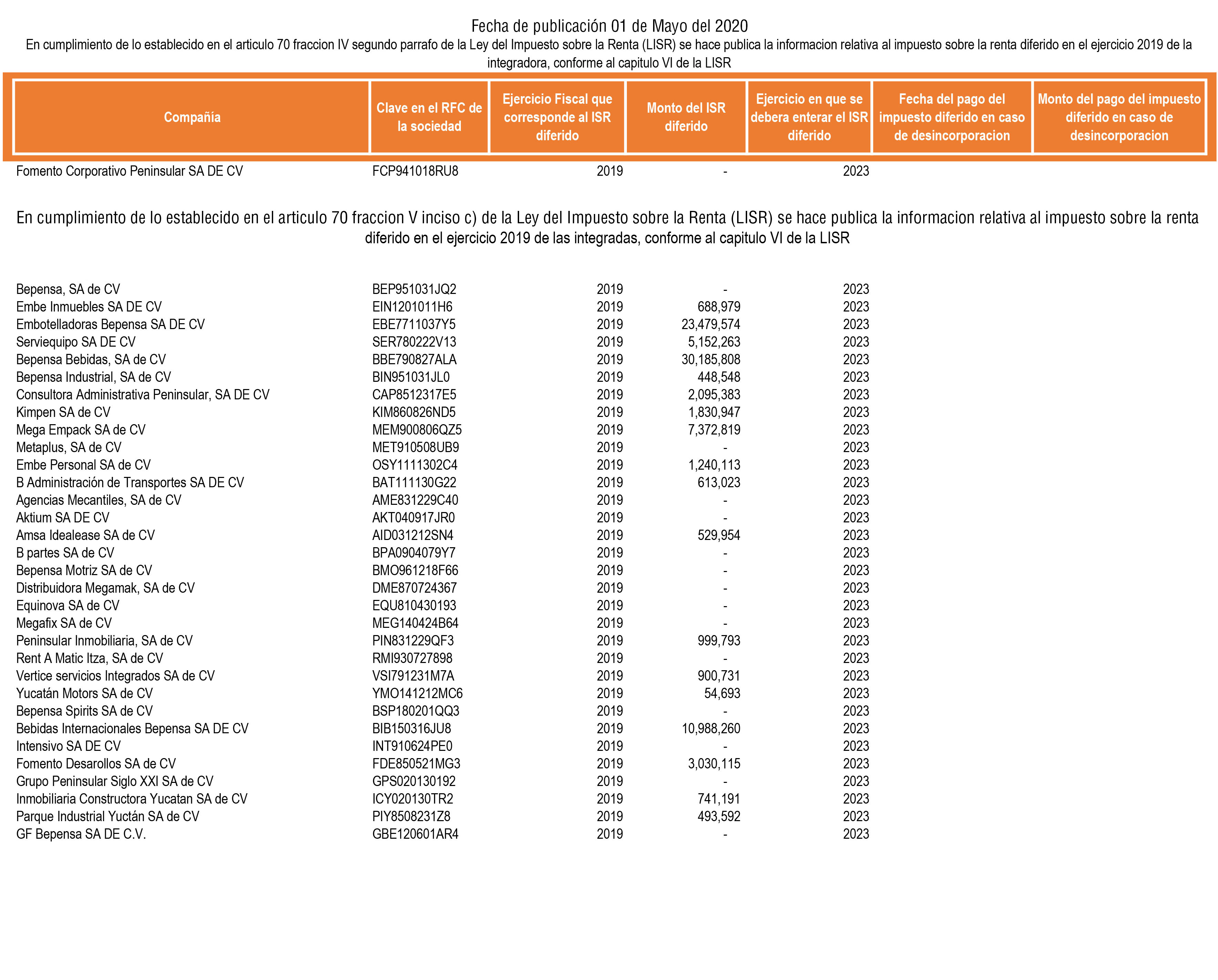 En cumplimiento al artículo 70 fracción V inciso c) de la Ley del Impuesto Sobre la Renta vigente (LISR) se hace pública la información relativa al impuesto sobre la renta diferido en el ejercicio fiscal 2014, de las Integradas, conforme al Capítulo VI de la LISR (del régimen opcional para grupos de sociedades). El ISR diferido es el siguiente