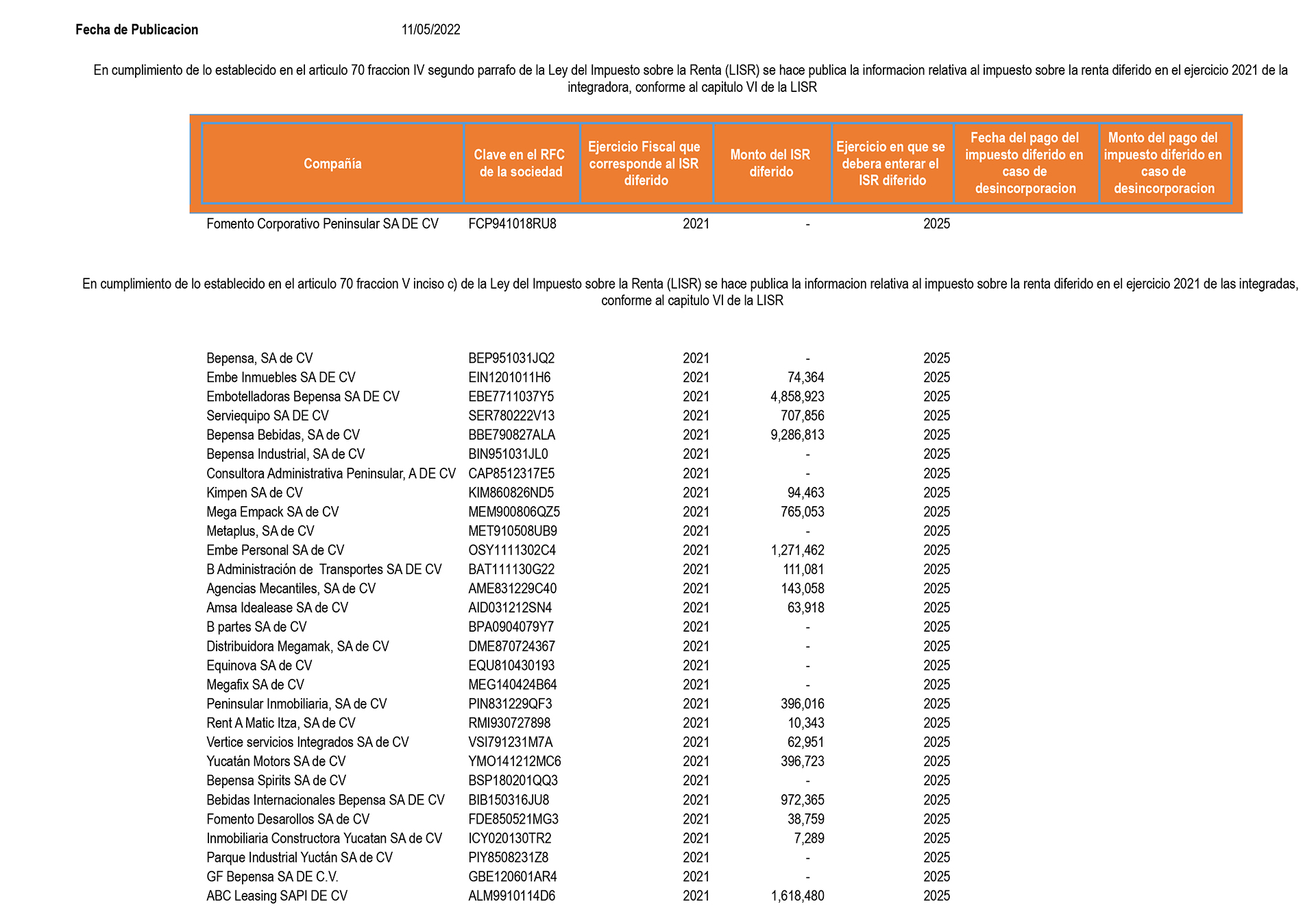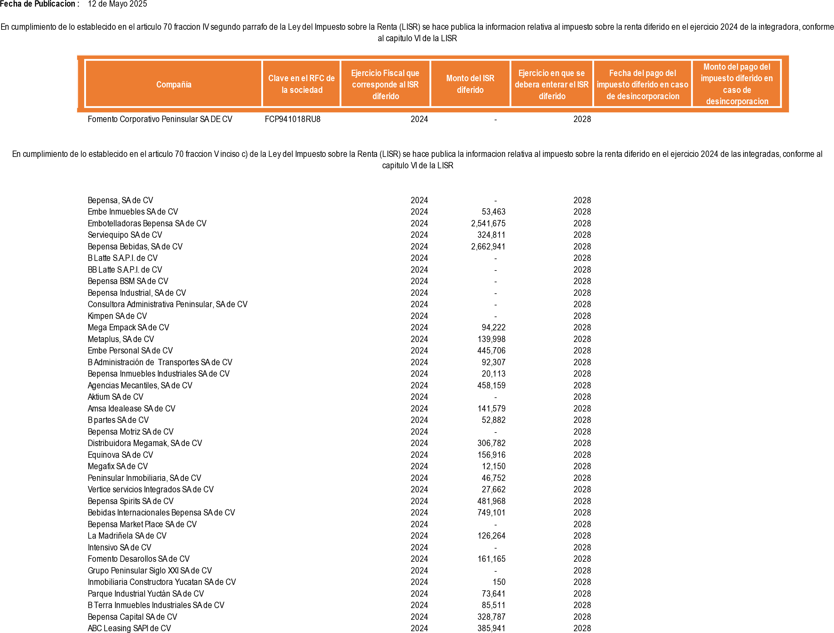 En cumplimiento al artículo 70 fracción V inciso c) de la Ley del Impuesto Sobre la Renta vigente (LISR) se hace pública la información relativa al impuesto sobre la renta diferido en el ejercicio fiscal 2015 de las Integradas, conforme al Capítulo VI de la LISR (del régimen opcional para grupos de sociedades). El ISR diferido es el siguiente: